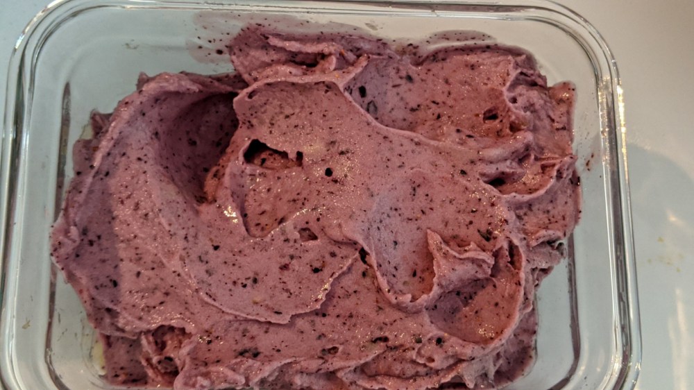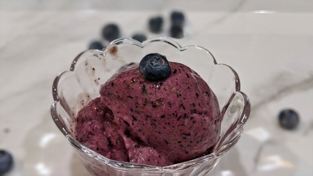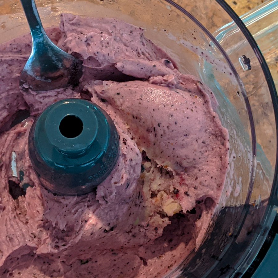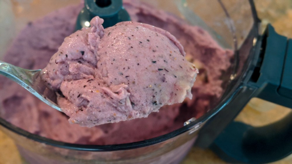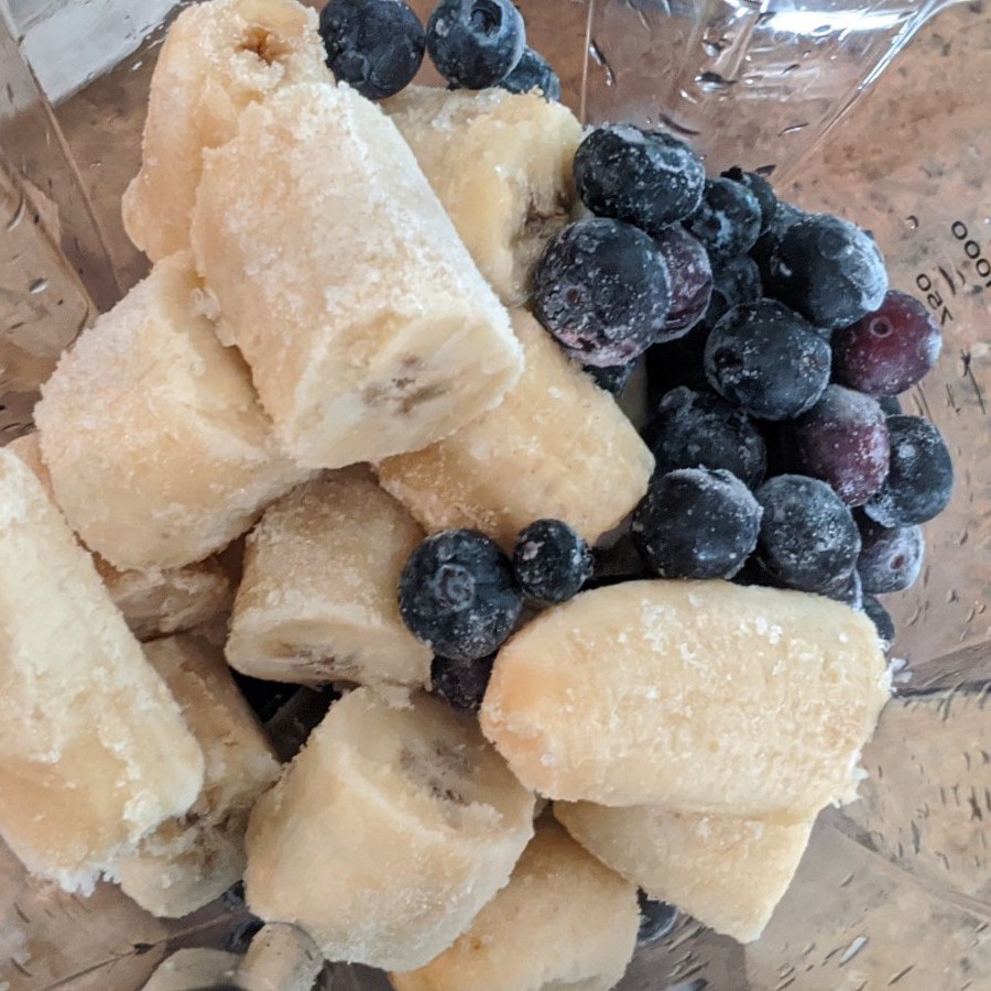 - In a food processor add frozen bananas, frozen blueberries and vanilla extract. Blend it till it all comes together about 8 to 10 minutes depending on your blender or food processor. You might have to take a break after every 2-3 minutes and mix it all around with a spoon for even blending.