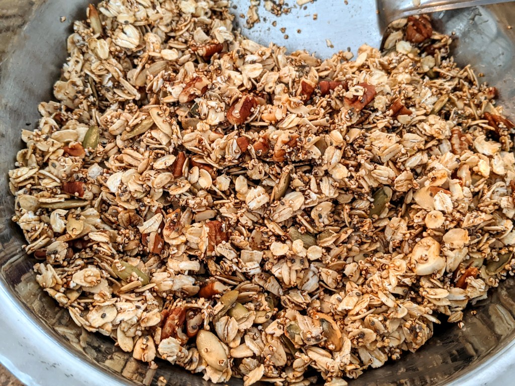 - In a large bowl add all the ingredients popped amaranth, oats, pecans, chia seeds, pepitas, and cinnamon. Stir it all together.